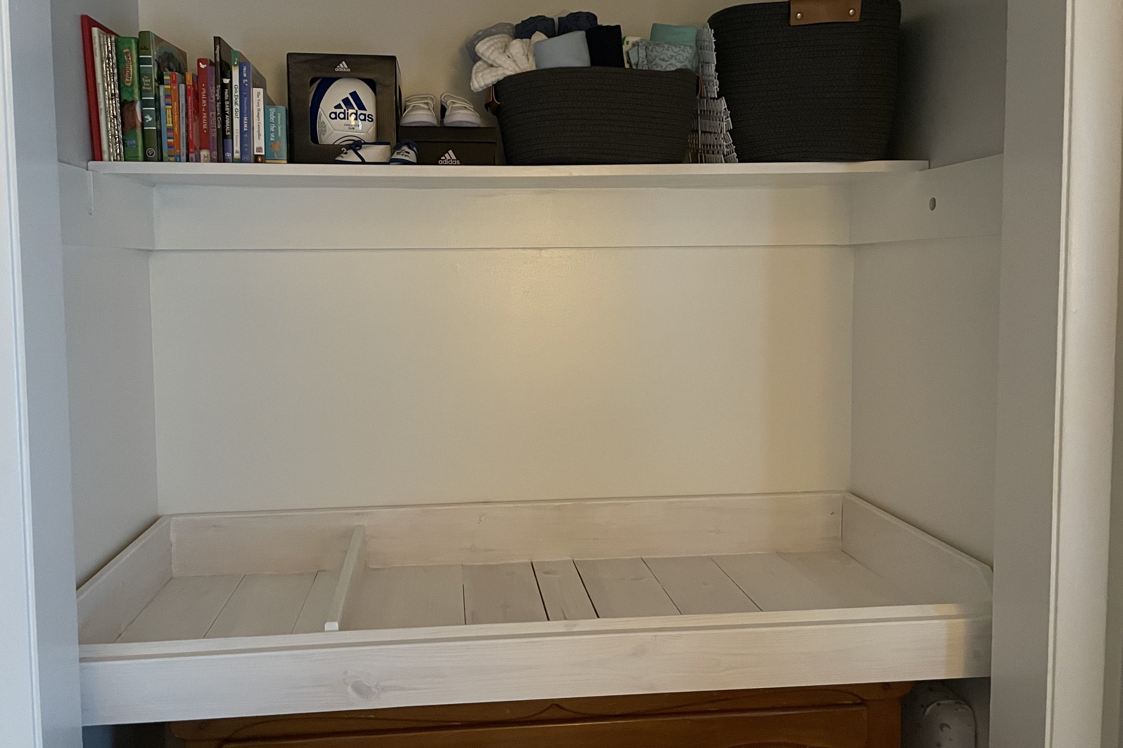 When we were getting ready for our son to be born we looked around at several stores for a diaper changing station. None of the stations we saw were the color or style that we envisioned. So I went to work designing and measuring the space we had available in his room, and built a changing station that was perfect for us.