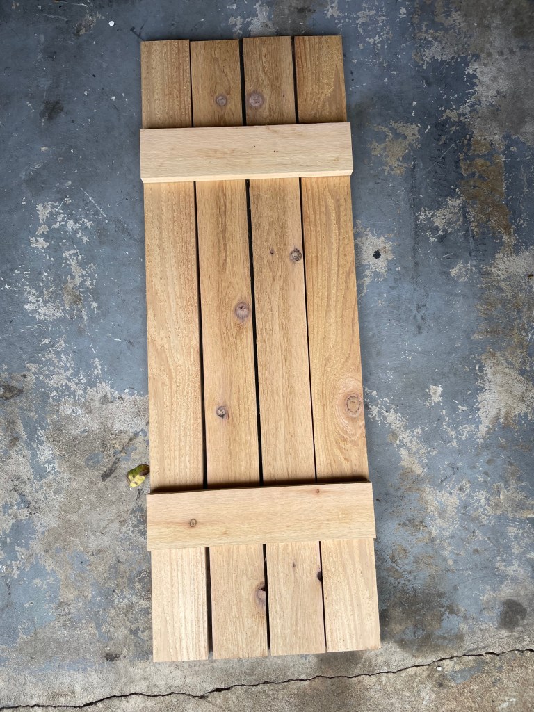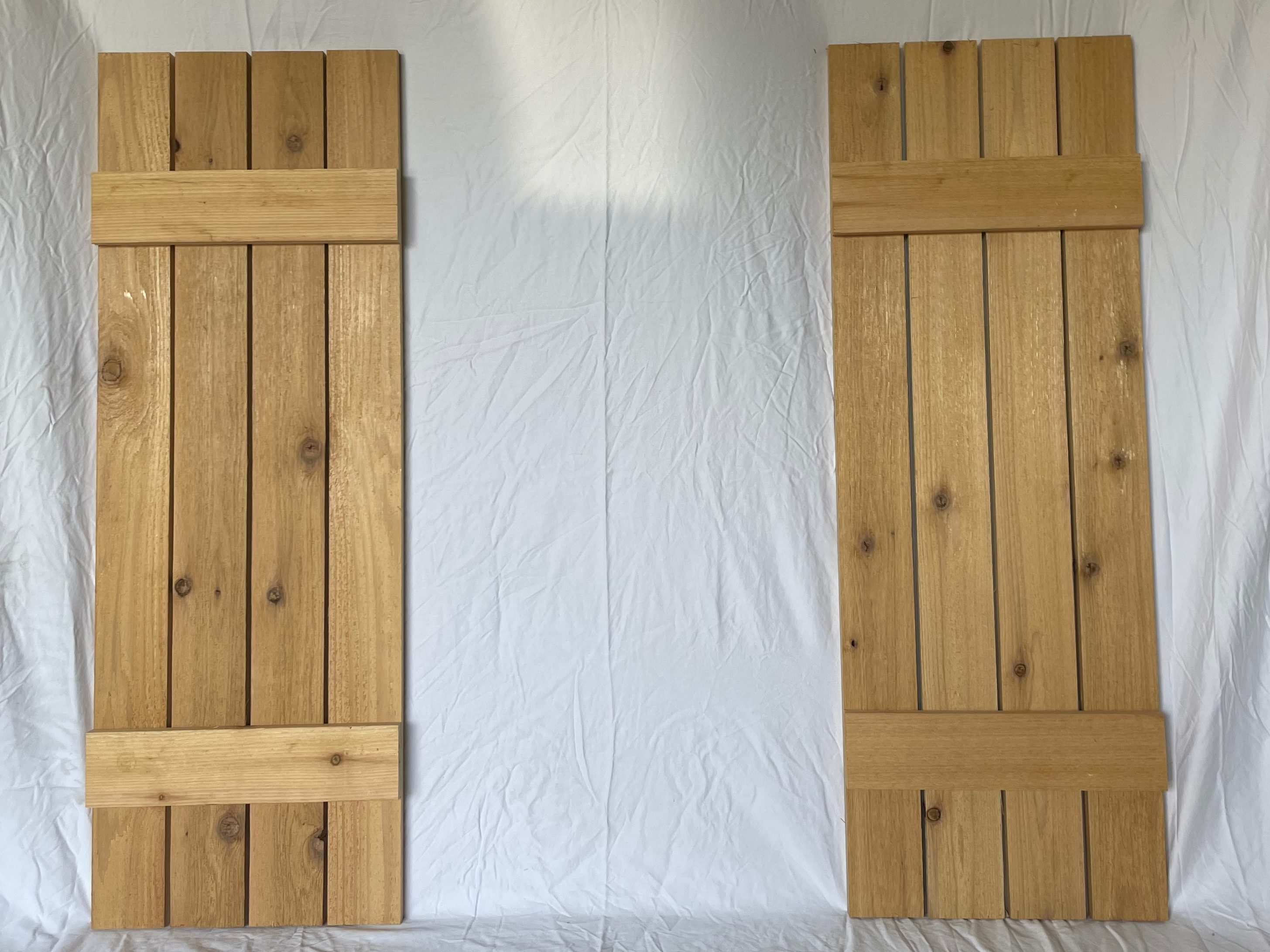 A few details that I chose to implement was using screws for each connection and wood glue. this will add longevity to the shutters, as an exterior product, the seasonal changes with cause the cedar to expand and contract, using screws instead of nails will help hold everything together longer. I also build the shutters upside down, this took a little more time, but the result was that none of the assembly screws were left visible when the shutters are installed on the house.